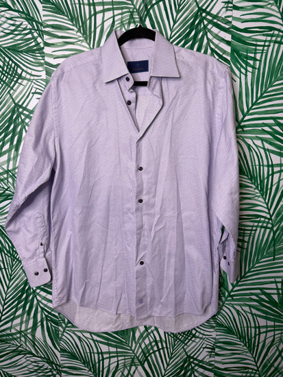 A high-end David Donahue dress shirt in a crisp lavender + white micro-grid pattern. Known for luxury menswear, David Donahue shirts are tailored, polished, and beautifully made. This one features contrast purple buttons, an embroidered cuff monogram detail, and a classic fit that works for both business and dressy events.