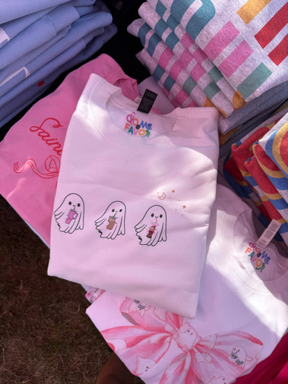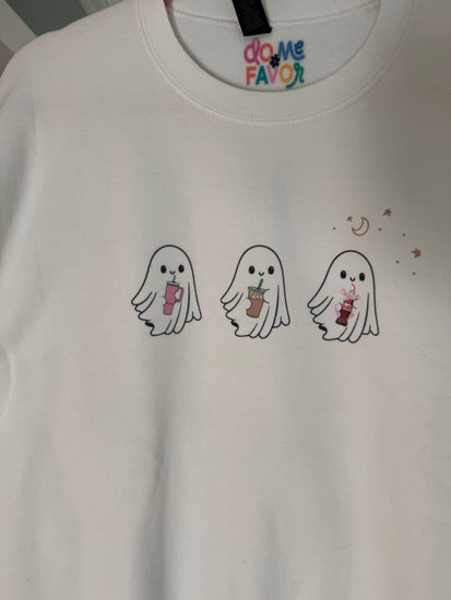 3 Cute lil' ghosts with their emotional support drinks; water, iced coffee and diet coke. Sweatshirt is very soft and unisex sizing is true to size.