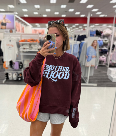 Custom design printed as screenprint on unisex oh so soft gildan sweatshirt. Size up for comfy cozy vibe. Maroon sweatshirt with baby blue design. “Motherhood” on chest and “some days I rock it some days it rocks me. Either way, we rockin’