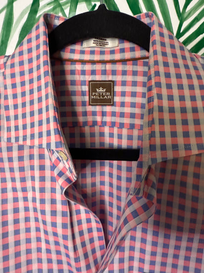 A classic, high-quality Peter Millar button-down in the perfect spring/summer color palette. Pink, blue, and white gingham check with button cuffs and that signature Peter Millar softness. Lightweight, crisp, and polished — perfect for the office, golf outings, date nights, or family photos.