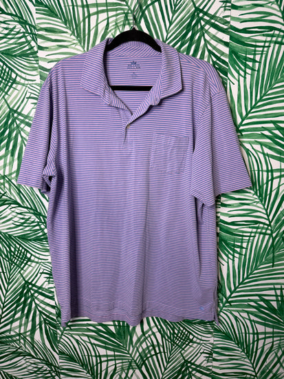 A classic Peter Millar performance polo in a lavender + light blue micro stripe. Lightweight, breathable, moisture-wicking, and insanely comfortable — these polos are elite for golf days, lake weekends, or everyday wear. Features the embroidered crown logo at the hem and a chest pocket.