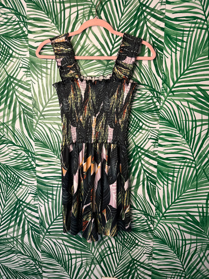 Color: Black base with tropical leaf print in green, pink, and gold tones