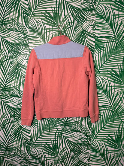 A classic Vineyard Vines staple in the prettiest coral-pink shade. This 100% cotton quarter-zip features contrasting light blue shoulder panels and the signature Vineyard Vines logo patch. Cozy, soft, and perfectly preppy — ideal for layering year-round.