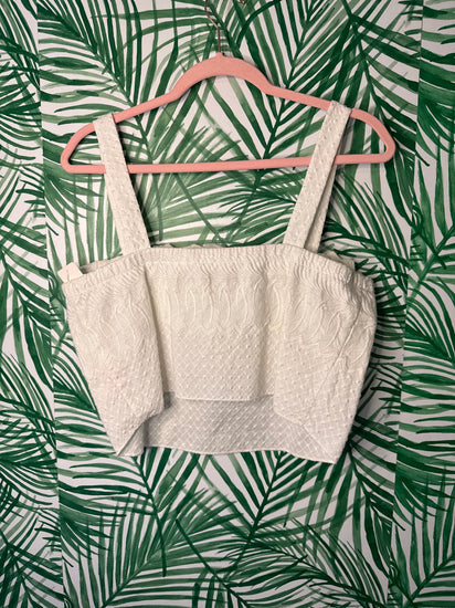 A chic and feminine white cropped blouse featuring intricate scalloped lace detailing along the top and a textured woven pattern throughout. The structured fabric and wide straps make it feel luxe while still keeping things breezy and wearable. Fully lined and designed in a pull-on style for easy comfort.